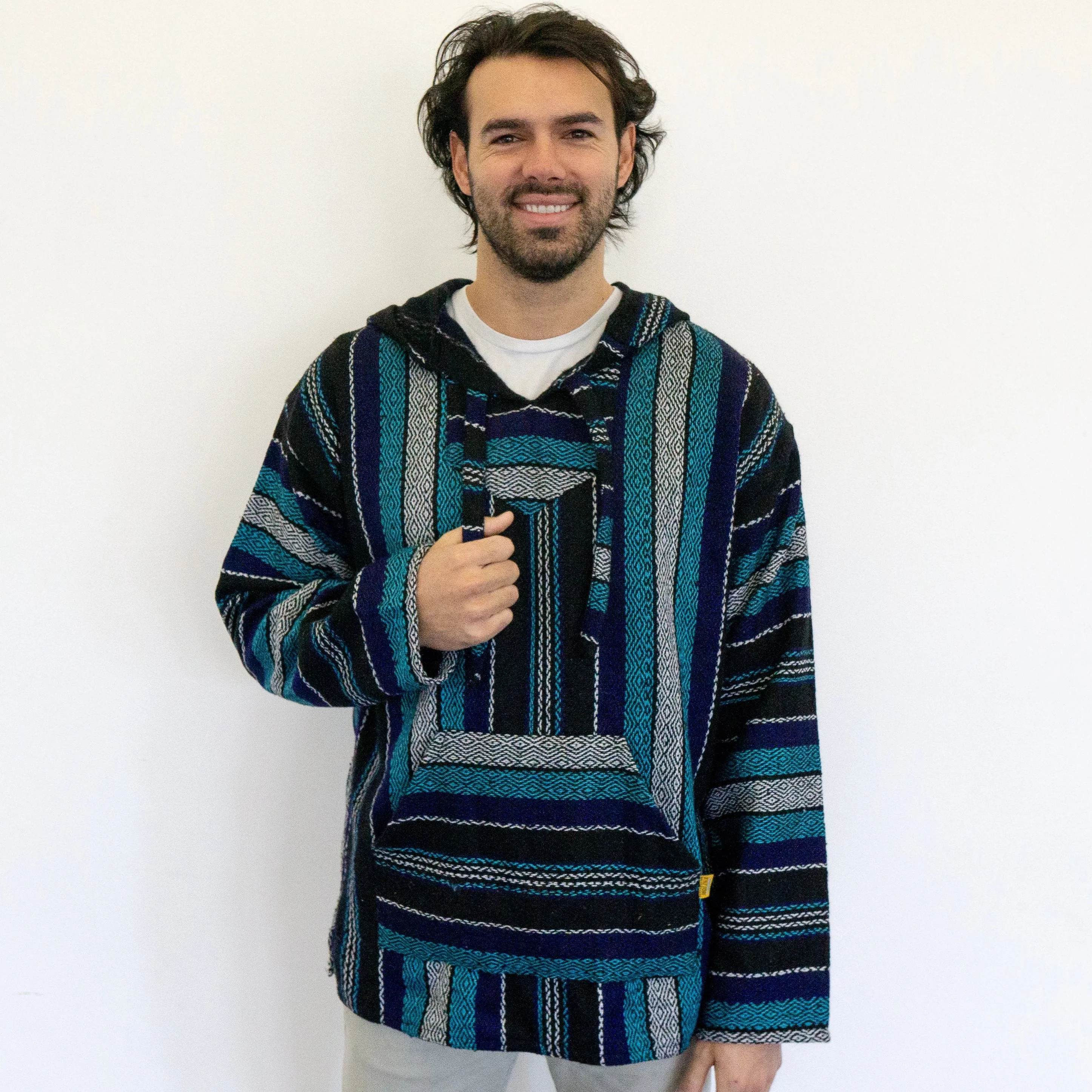 - Our Baja Hoodies aka "Drug Rugs" are all Handwoven from 100% Recycled Fibers, hand-picked to ensure the highest quality!